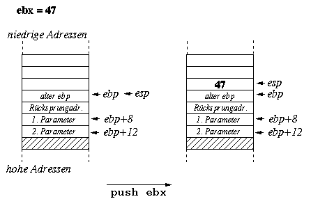 Um innerhalb der Funktion auf die Parameter zugreifen zu können, wird üblicherweise der Basepointer ebp zu Hilfe genommen. Wenn er gleich zu Anfang der Funktion gesichert und dann mit dem Wert des Stackpointers belegt wird, kann der erste Parameter immer über [ebp+8] und der zweite Parameter über [ebp+12] erreicht werden, unabhängig davon, wieviele push- und pop-Operationen seit Beginn der Funktion verwendet wurden.
