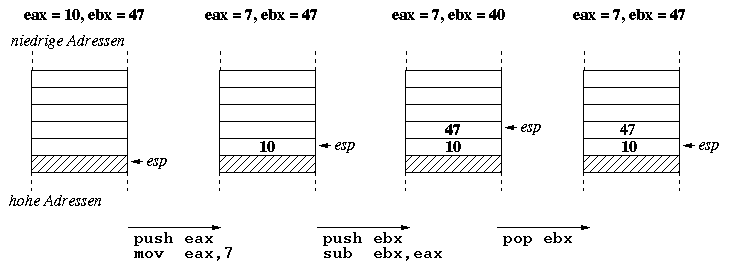 Nicht immer will man sich ein neues Label ausdenken, nur um kurzfristig den Wert eines Registers zu speichern; beispielsweise, weil man das Register für eine bestimmte Anweisung benötigt, den alten Wert aber nicht verlieren möchte. In diesem Fall wünscht man sich etwas wie einen Schmierzettel. Den bekommt man mit dem Stack. Der Stack ist eigentlich nichts weiter als ein Stück des Hauptspeichers, nur dass dort nicht mit festen Adressen gearbeitet wird, sondern die zu sichernden Daten einfach immer oben drauf geschrieben (push) bzw. von oben heruntergeholt werden (pop). Der Zugriff ist also ganz einfach, vorausgesetzt man erinnert sich daran, in welcher Reihenfolge die Daten auf den Stapel gelegt wurden. Ein spezielles Register, der Stackpointer esp, zeigt stets auf das oberste Element des Stacks. Da push und pop immer nur 32 Bits auf einmal transferieren können, ist der Stack in der folgenden Abbildung als vier Bytes breit dargestellt.